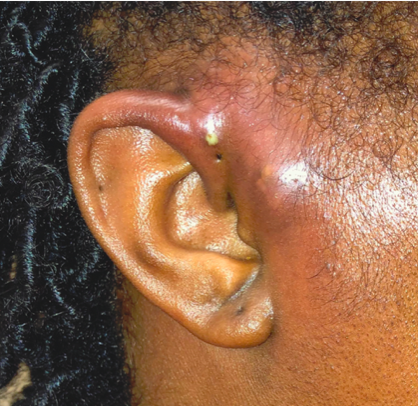 Ilustrasi perikondritis pada daun telinga.
