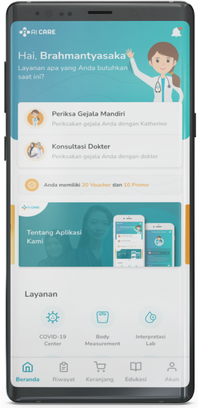 Ai Care, menggabungkan teknologi AI dengan tenaga kesehatan professional untuk memberikan perawatan yang terbaik. Kami berusaha menghadirkan informasi dan tenaga kesehatan di genggaman tangan Anda kapanpun dan dimanapun. Dengan bantuan teknologi AI, kami menghadirkan bantuan untuk meringankan beban dokter kami. Sehingga dokter dapat lebih fokus pada tujuannya yaitu memberikan perawatan dan penanganan terbaik untuk pasien-pasiennya. Selain itu, teknologi kami juga menawarkan informasi medis yang tepat dan akurat untuk membantu pasien dalam mengambil keputusan yang tepat dan menjaga kesehatannya.