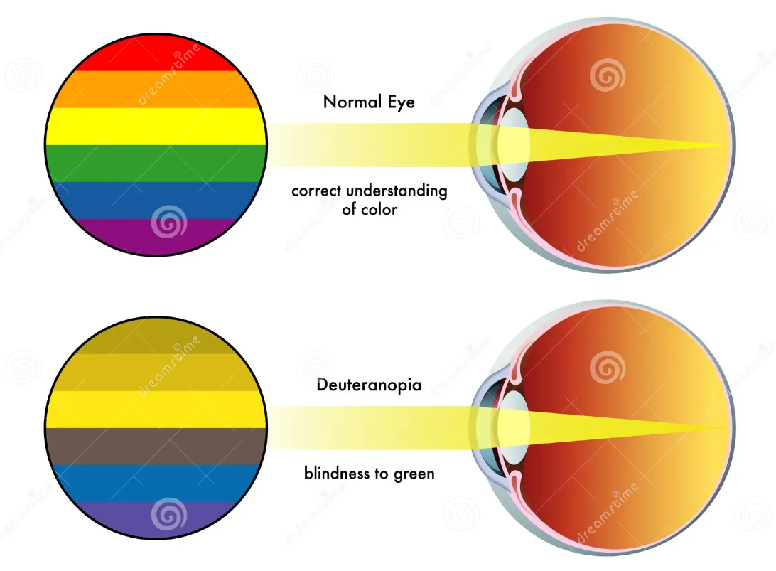 Mata tidak memiliki sel kerucut hijau sehingga individu yang mengalaminya melihat warna merah mejadi kuning kecoklatan dan warna hijau menjadi krem.