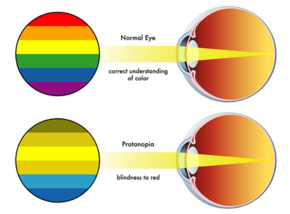 Pada kasus ini tidak terdapat sel kerucut merah sehingga warna merah terlihat hitam, warna jingga dan hijau akan terlihat kuning serta orang akan kesulitan membedakan warna ungu dan biru.