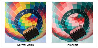 Buta warna jenis ini termasuk yang jarang terjadi. Pada buta warna jenis ini orang akan sulit membedakan antara warna biru dengan hijau dan kuning dengan merah. Buta warna jenis ini dapat dibedakan menjadi dua, yaitu:
